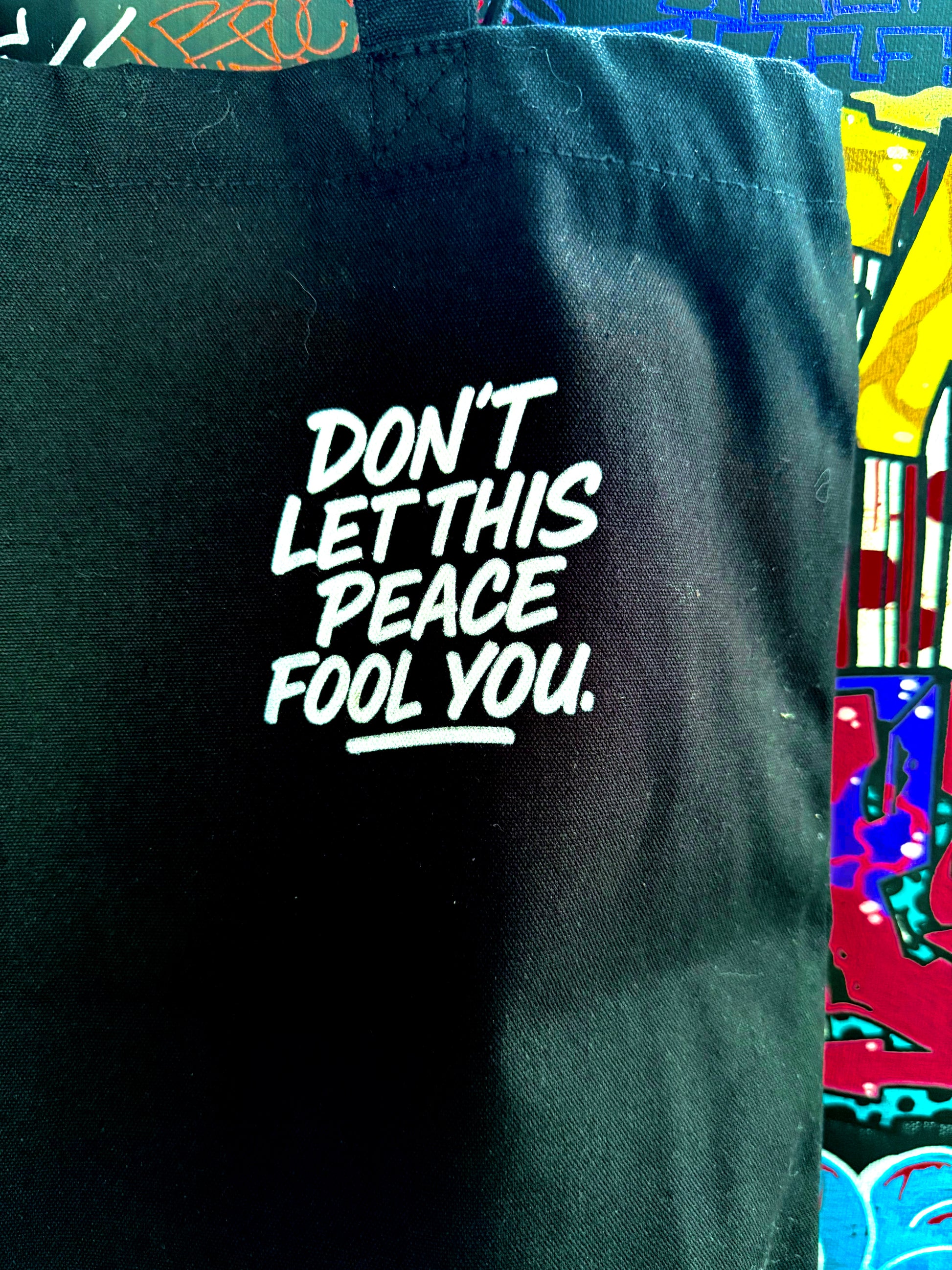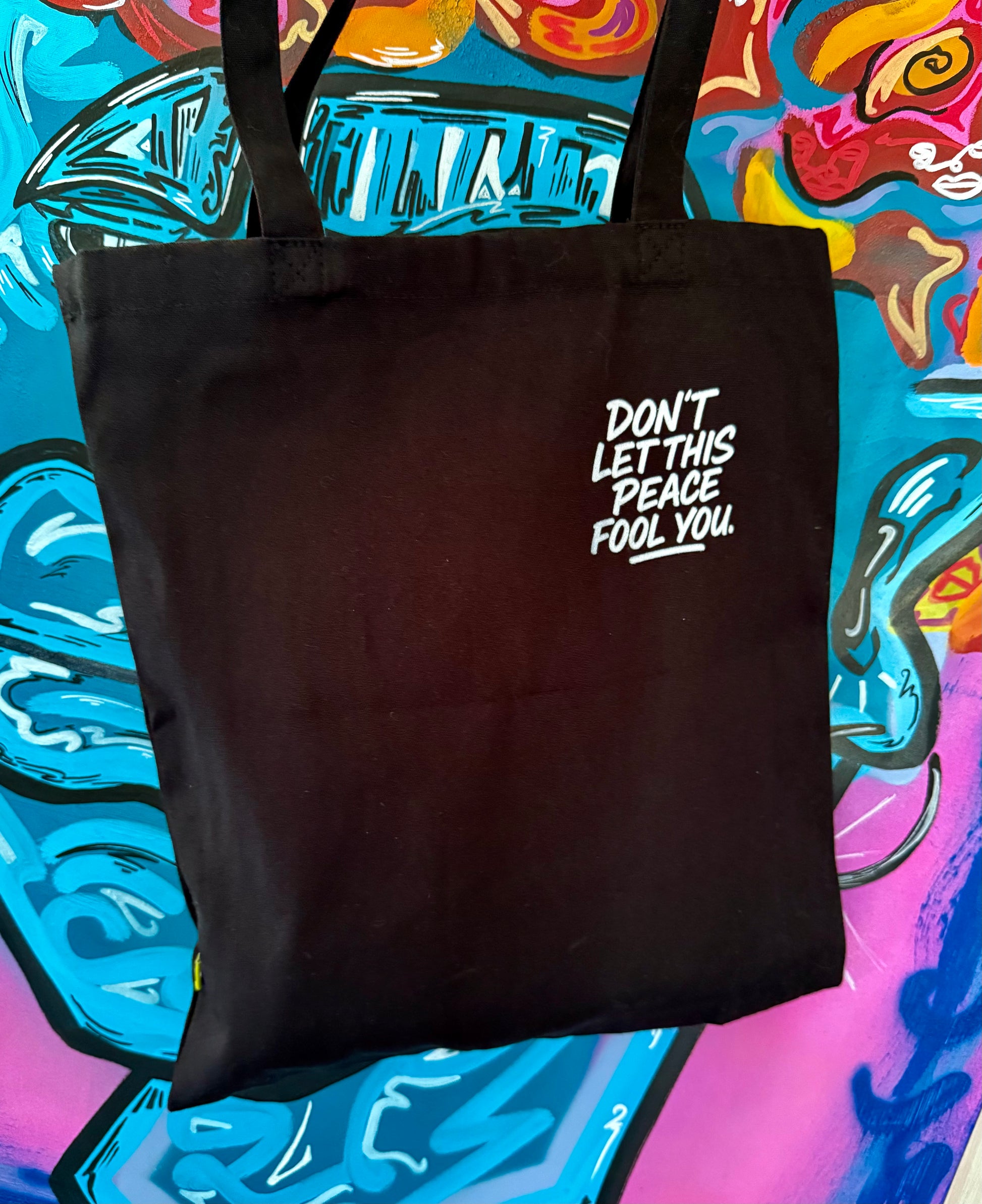 The “Don’t Let This Peace Fool You” Tote – minimal look, bold message.